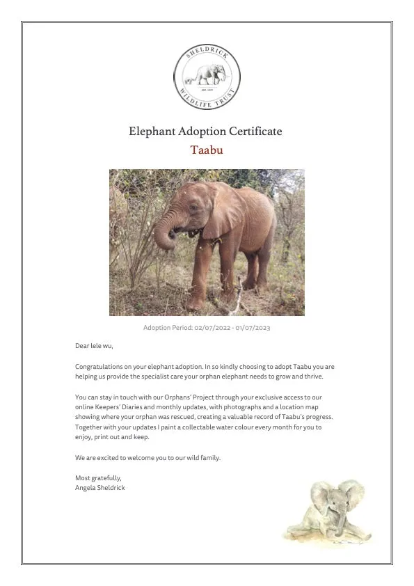 We named him Taabu, which means “trouble” in Swahili. This is not a nod to his character — Taabu is an extremely cheerful and easy-going elephant — but rather to the troubled times in which he was orphaned. He is one of the lucky ones, spared from the fate that befalls so many calves during a challenging dry season.
